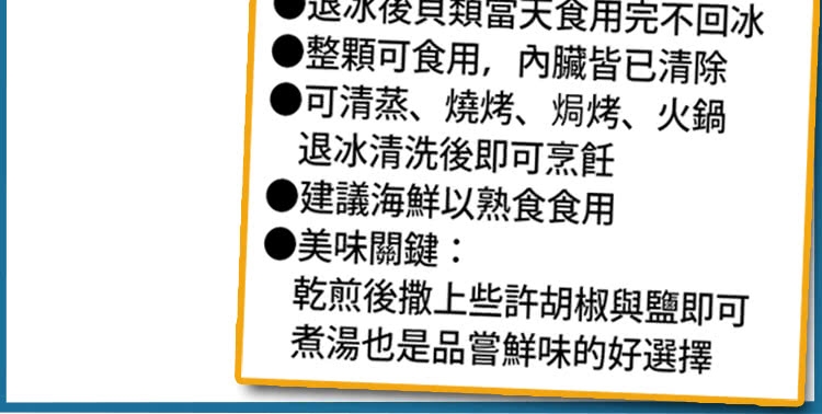 1. 冷凍退冰後, 烹煮食用2. 請於保鮮期內食用完畢3. 不食用時, 請置於冷凍櫃內保存