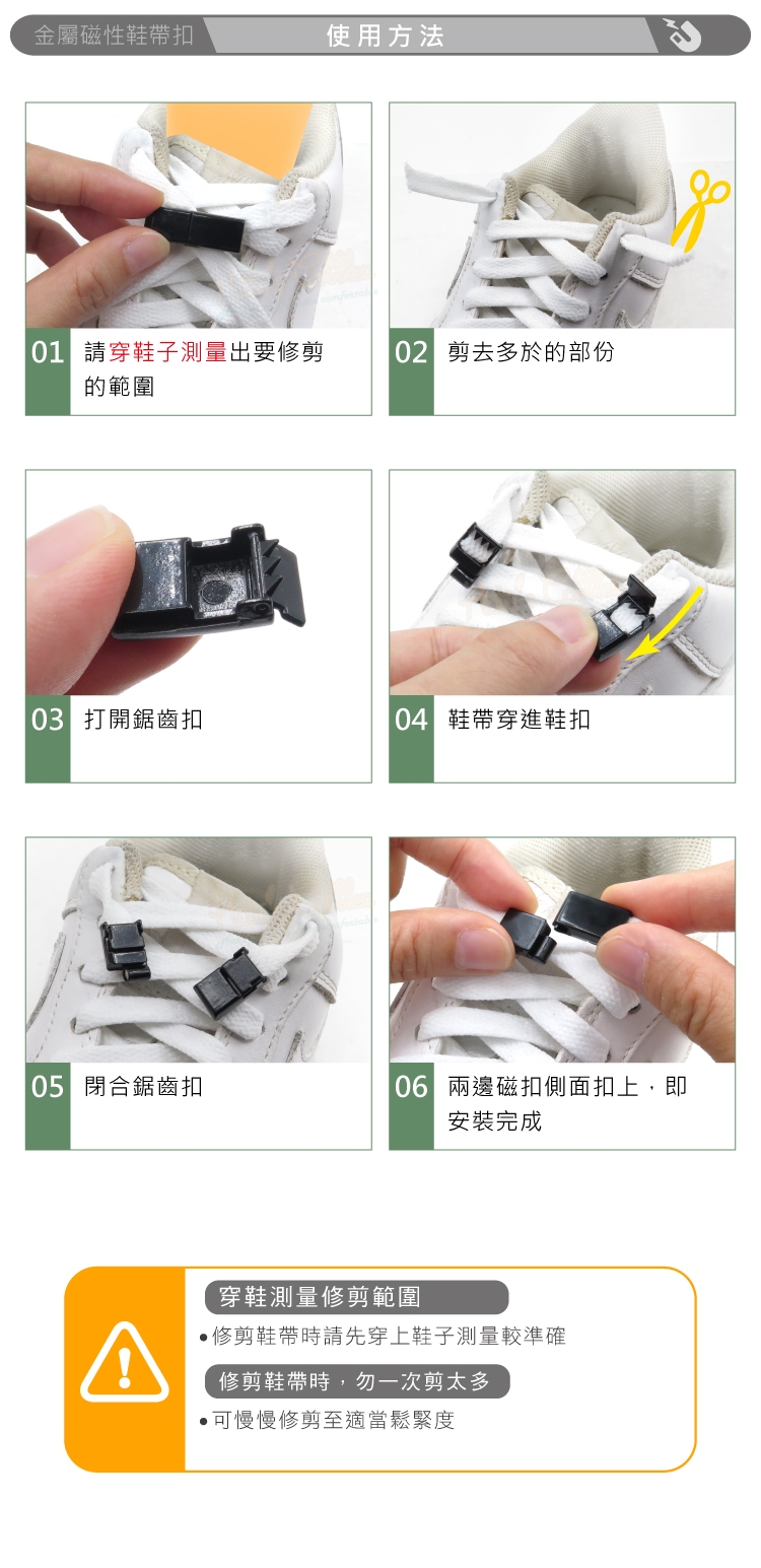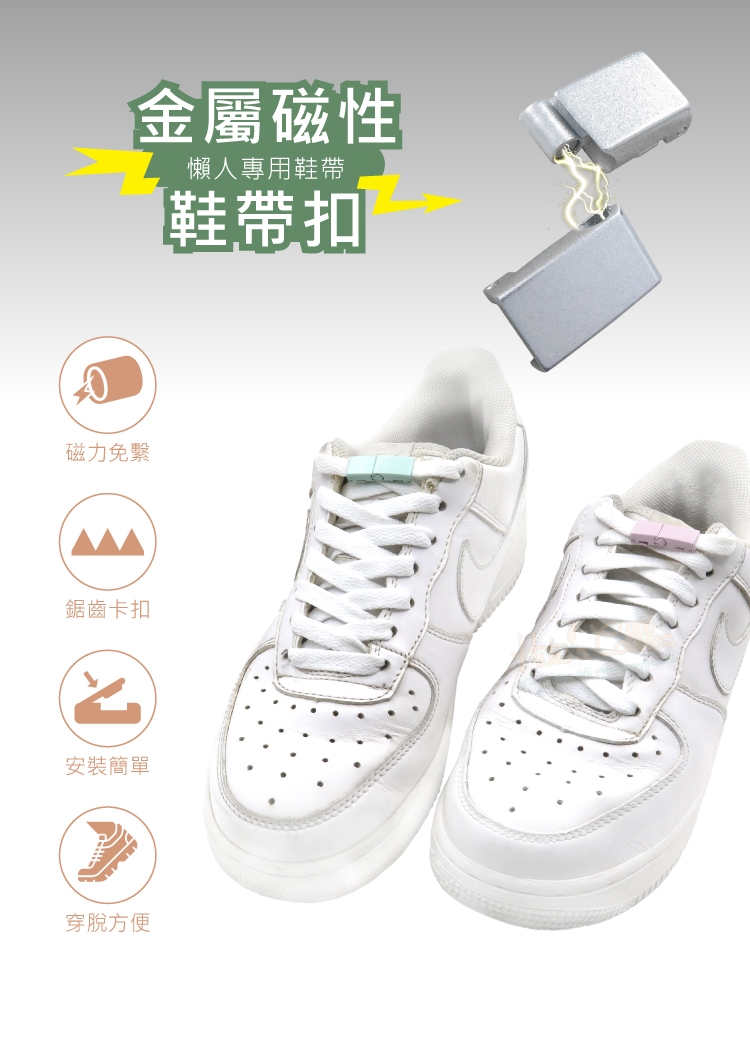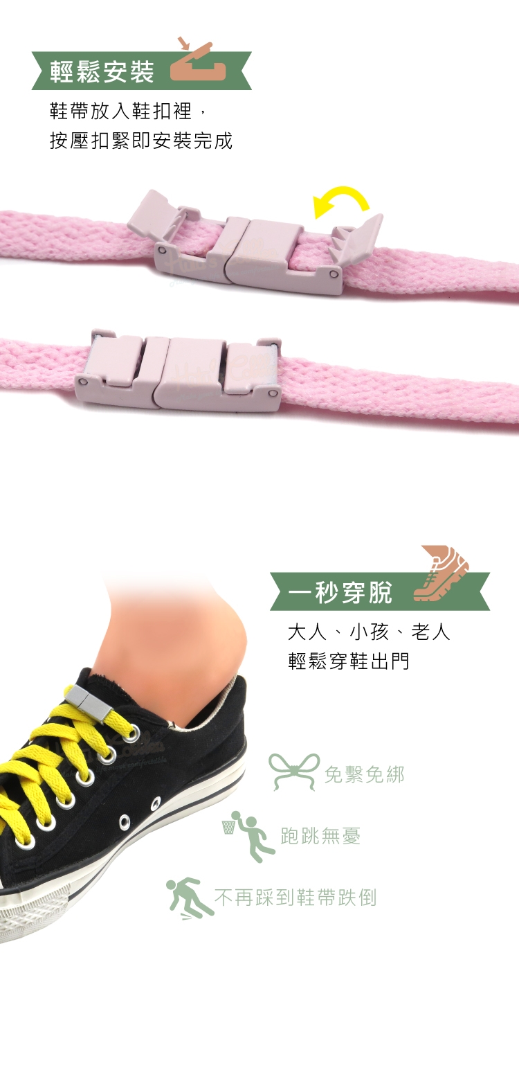 輕鬆安裝:鞋帶放入鞋扣裡,按壓扣緊即安裝完成
