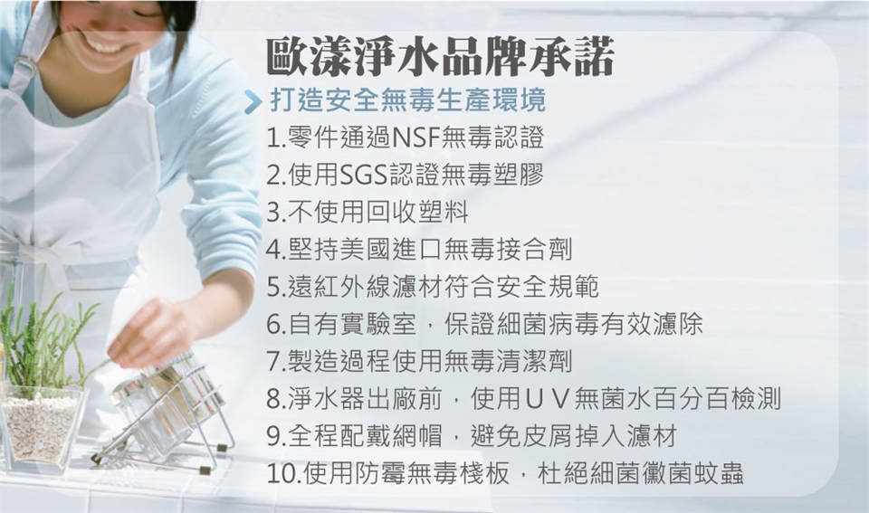 NSF認證中空絲膜濾材,孔徑0.15微米,小於水中細菌,並保留水中礦物質