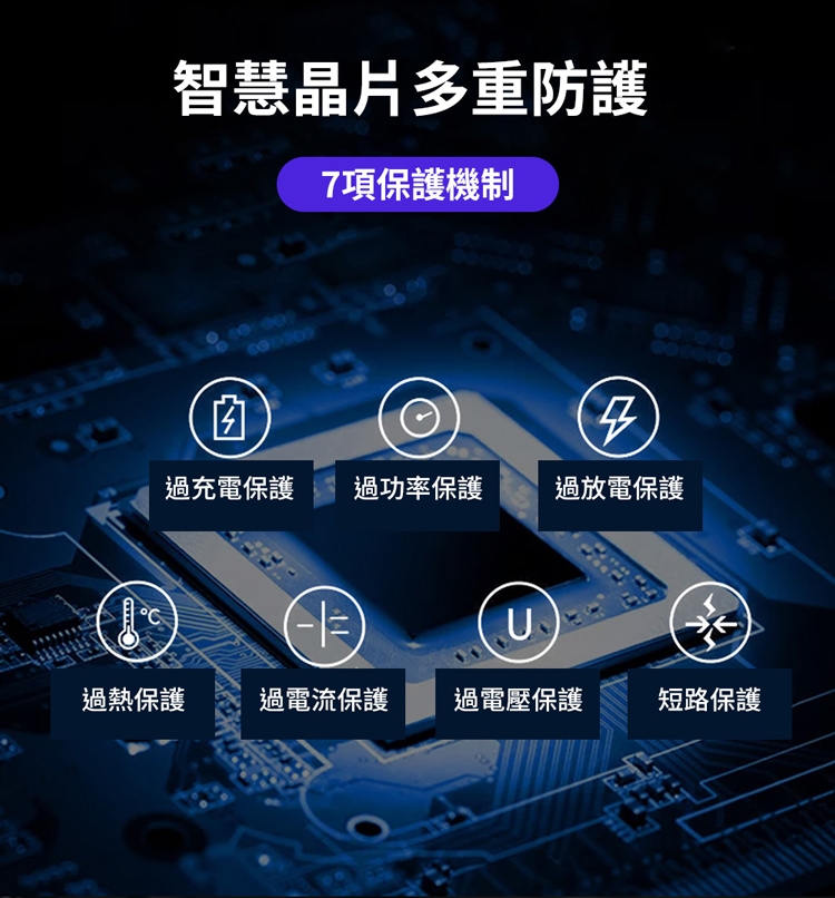 * 具備七大防護,防止過充電、過放電、過功率、過電流、過電壓、過熱、短路