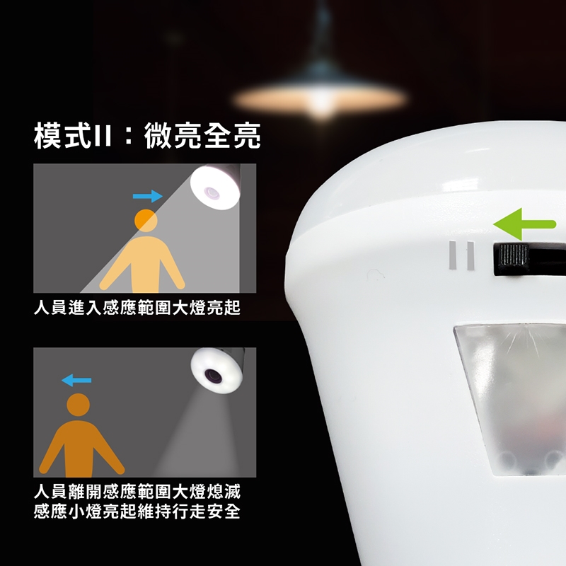 模式II(模式為全亮微亮):在光線不足或夜間時,首先光敏小夜燈提供光源;而當人體於感應範圍內活動,紅外線大感應燈自動亮燈且小燈熄滅。當人體離開感應範圍,大燈將持續亮當約30~45秒後自動關閉,光敏感應小燈及自動亮起維持光源。