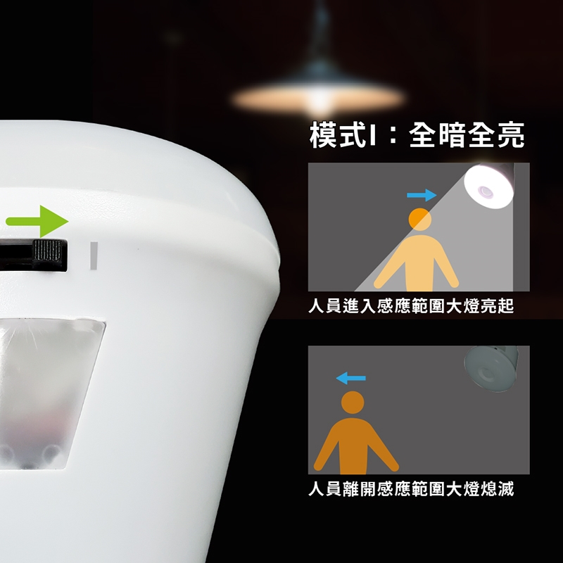 模式I(模式為全亮全暗):紅外線人體感應大燈,配置光敏感應器,光罩度大於15LUX和白天時不亮燈,感應角度約90度(左右各45度),感應距離約2~5米,感應亮燈時間約30~45秒,在燈未熄時再次感應或有持續有動作則亮燈時間再延長。