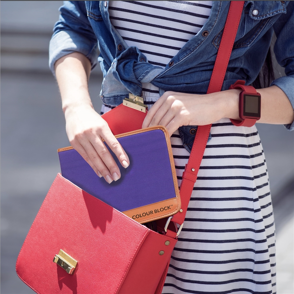 採用精美呈現的紫色帆布製成的拉鍊外盒, 帶有皮革外觀配飾,