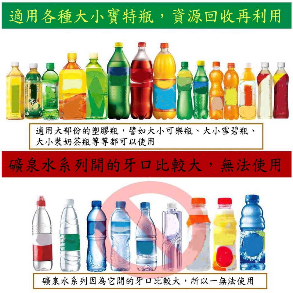 ■適用各種大小寶特瓶,資源回收再利用,綠色環保地球(適用大部份的塑膠瓶,譬如大小可樂瓶、大小雪碧瓶、大小裝奶茶瓶等等都可以使用。但礦泉水系列因為它開的牙口比較大,所以一般礦泉水瓶無法使用)。