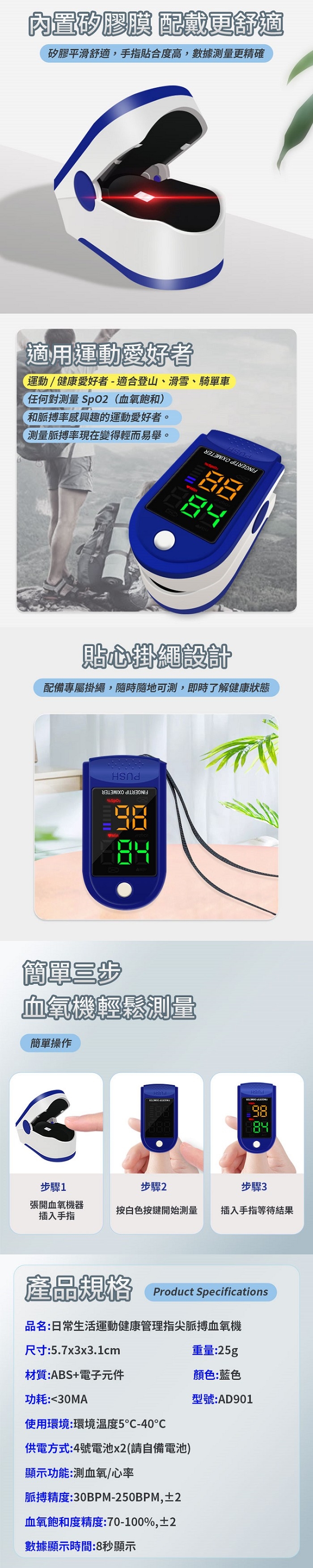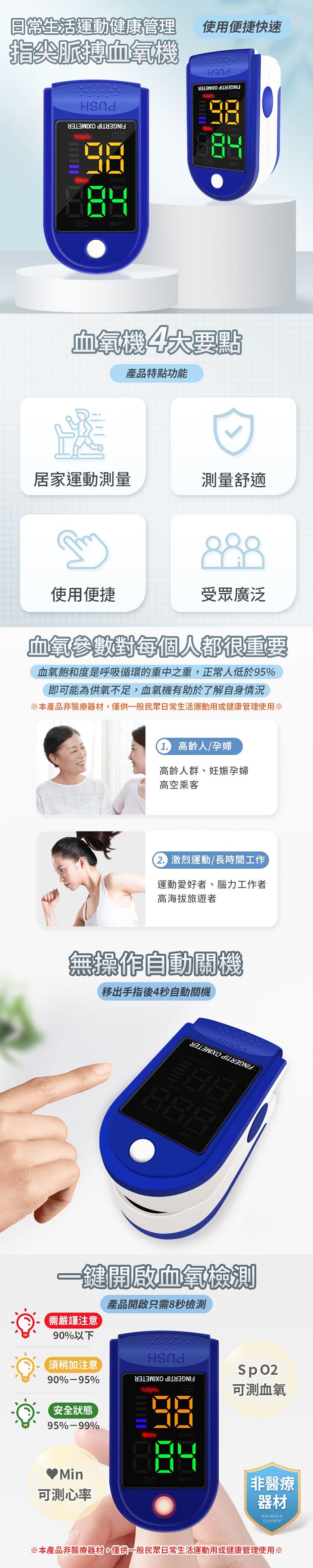 3.使用時需注意擦指甲油、穿戴人造指甲,或是手指血液循環不佳均可能影響量測結果。