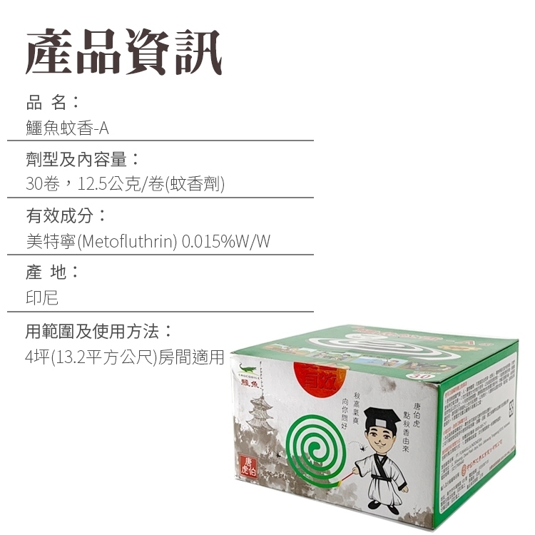 劑型及內容量:30卷,12.5公克/卷(蚊香劑)