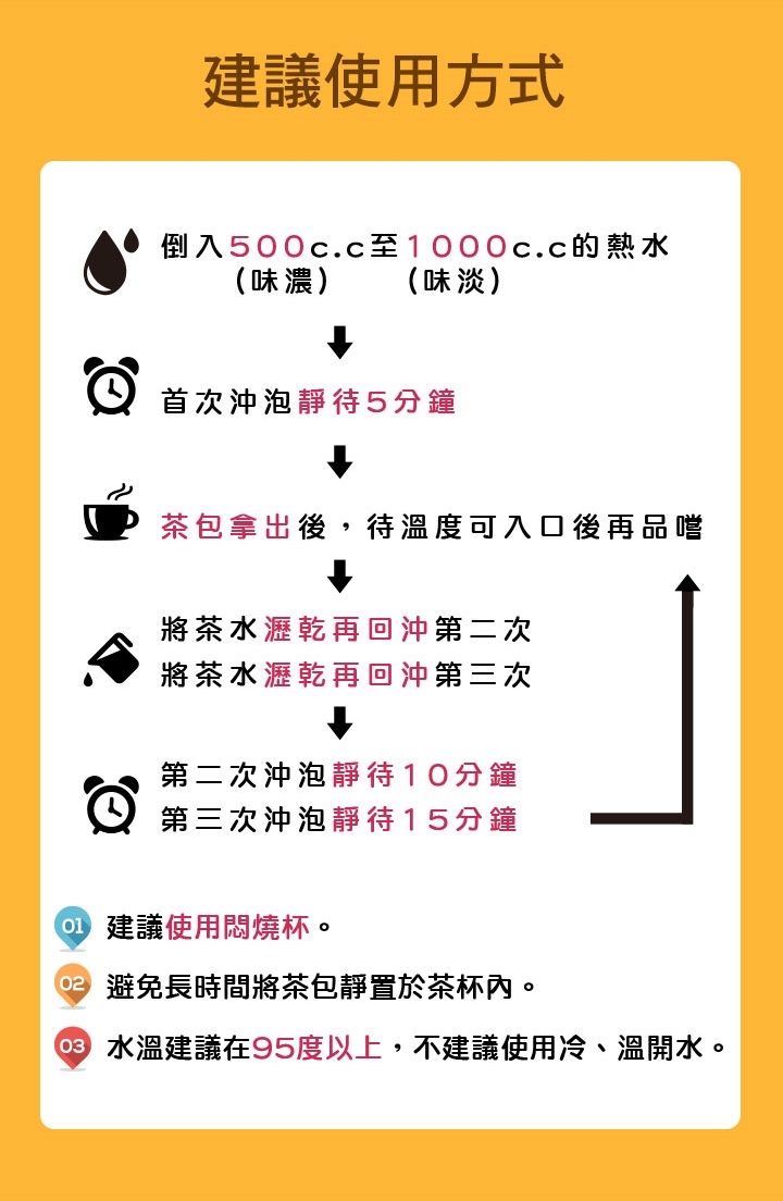 ※可依個人喜好,增減水量,調整濃淡,反覆沖泡至無味。