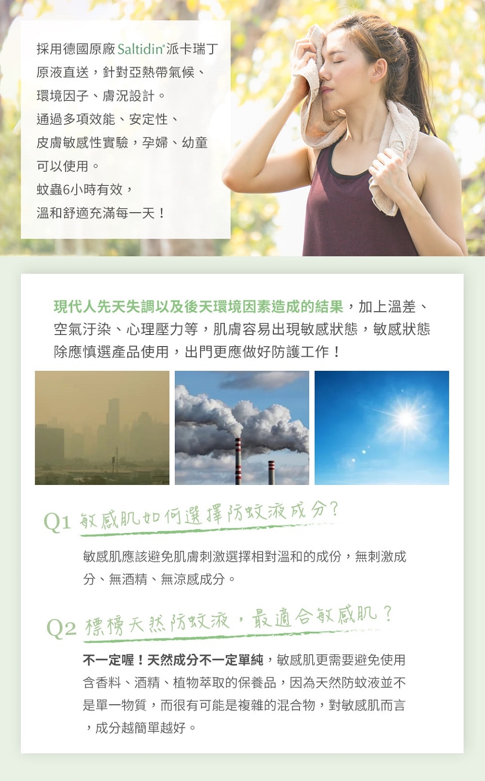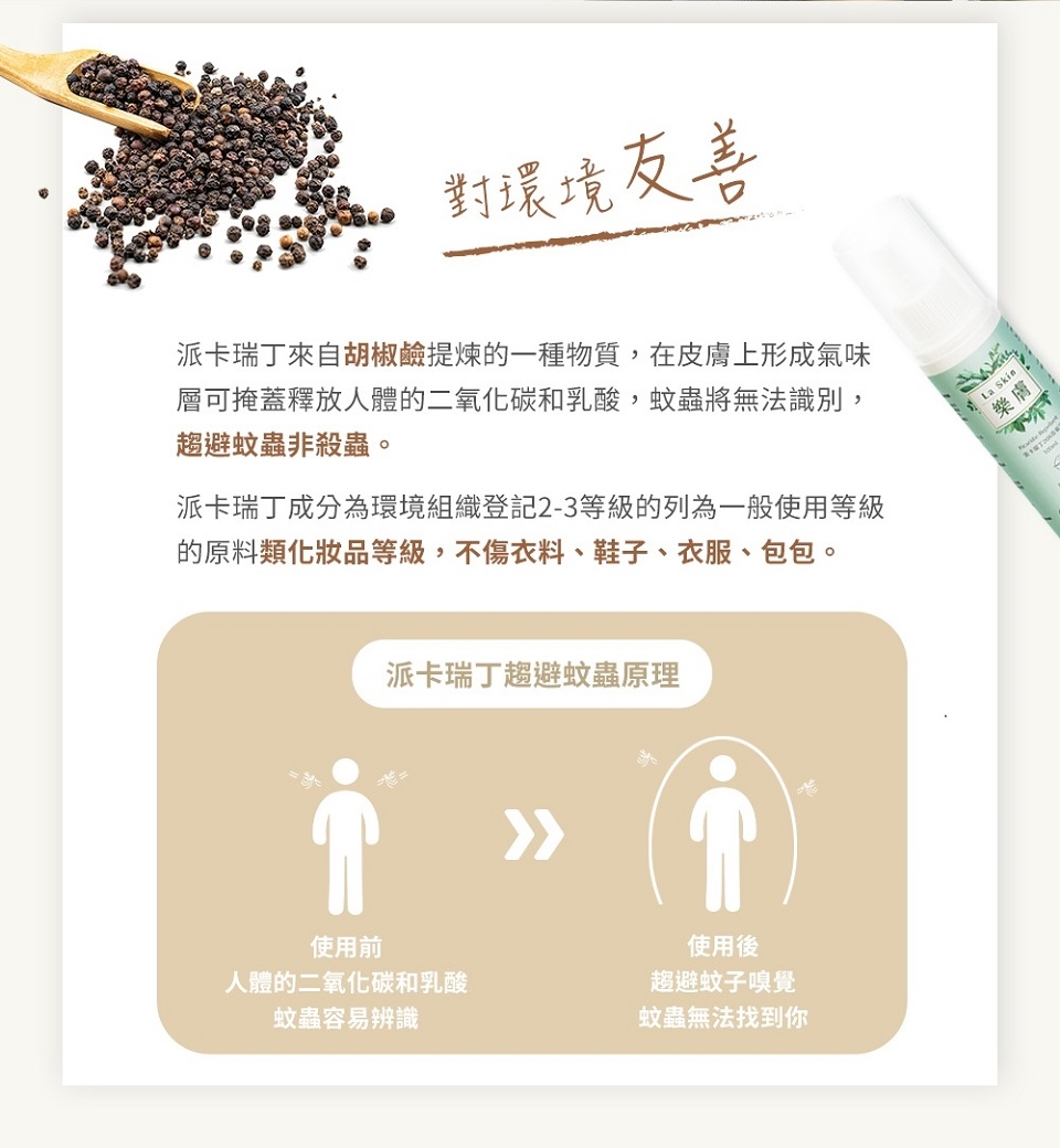 派卡瑞丁來自胡椒鹼提煉的一種物質,在皮膚上形成氣味層可掩蓋釋放人體的二氧化碳和乳酸,蚊蟲將無法識別,趨避蚊蟲非殺蟲。