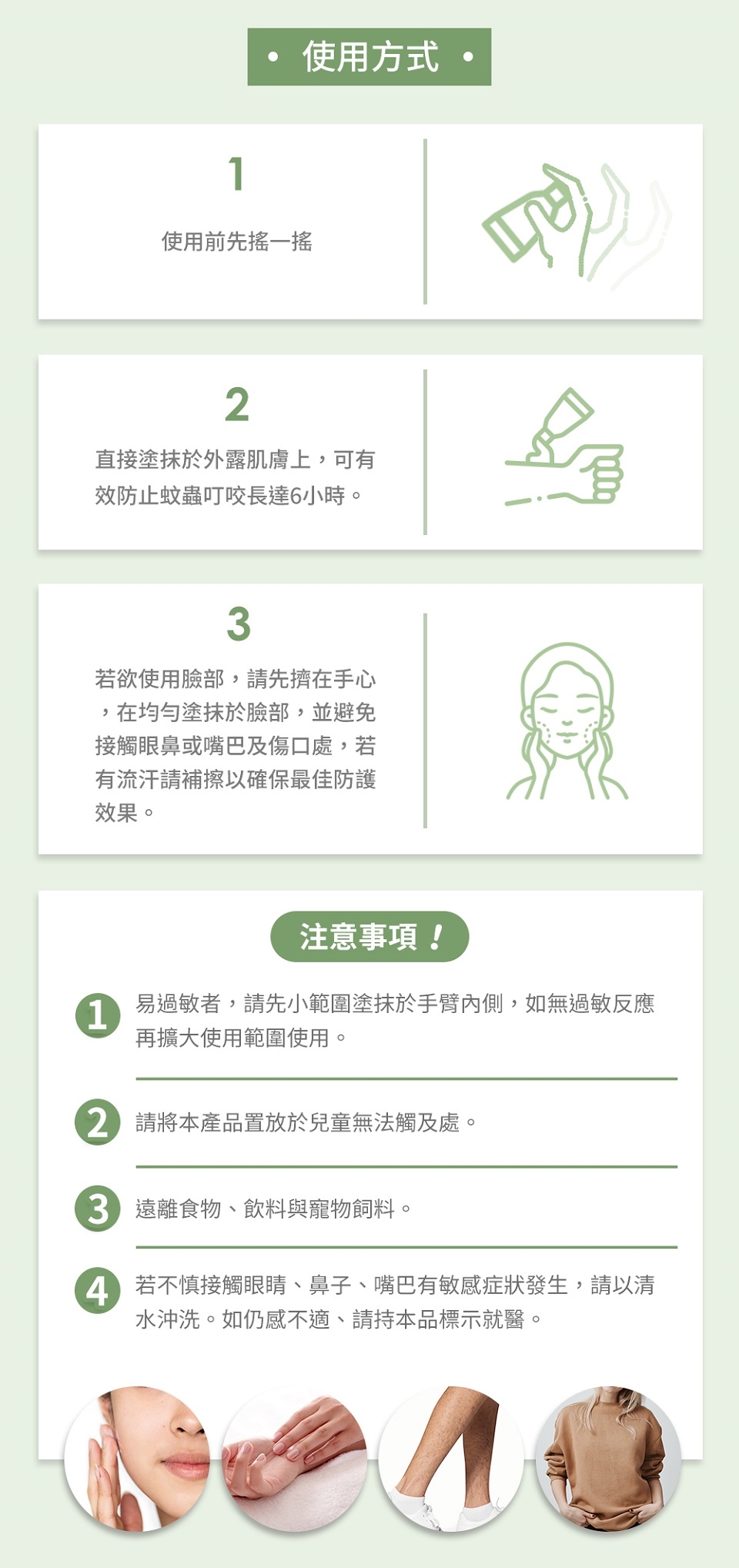 1.直接塗抹於外露肌膚上,可有效防止蚊蟲叮咬長達6小時。2.若欲使用於臉部,請先擠在手心,再均勻塗抹於臉部,並避免接觸眼鼻或嘴巴及傷口處,若有流汗請補擦以確保最佳防護效果。