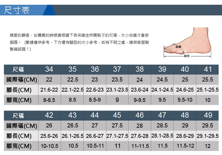 2.鞋類商品依功能及用途之不同,鞋底各有其止滑係數之個別不同,使用鞋類商品請用於正常平坦之路面,非雨鞋或雨靴類商品,請避免穿著於下雨濕滑路面上行走。