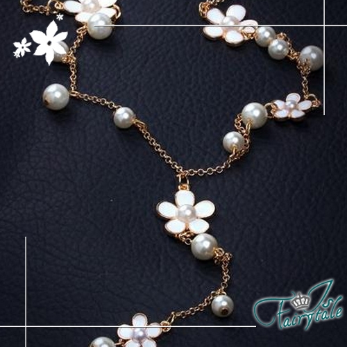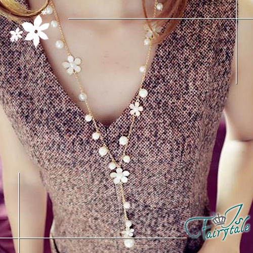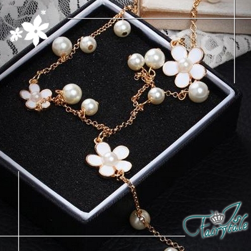 不規則的白花與珍珠串連成長鍊,下方垂墬隨動作搖曳,
