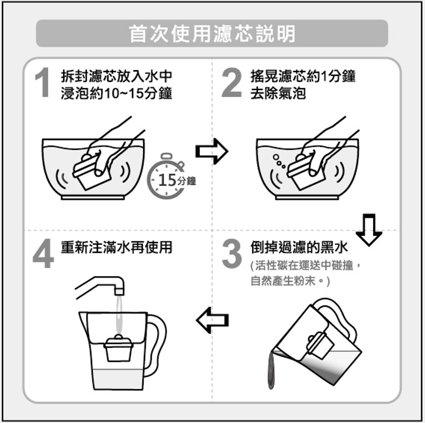 (1)取出濾心輕晃幾下,安裝於濾水壺