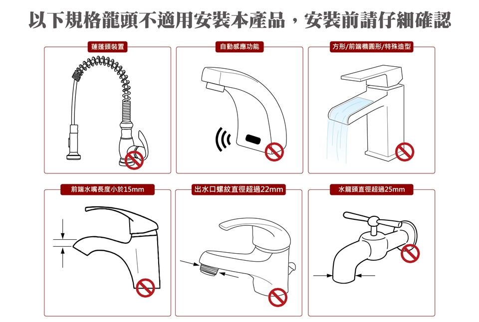 1、水龍頭之出水口尺寸是1/2",請將小橡膠塞入大橡膠內,再套上水龍頭出水口,並套上頸圈後鎖緊。
