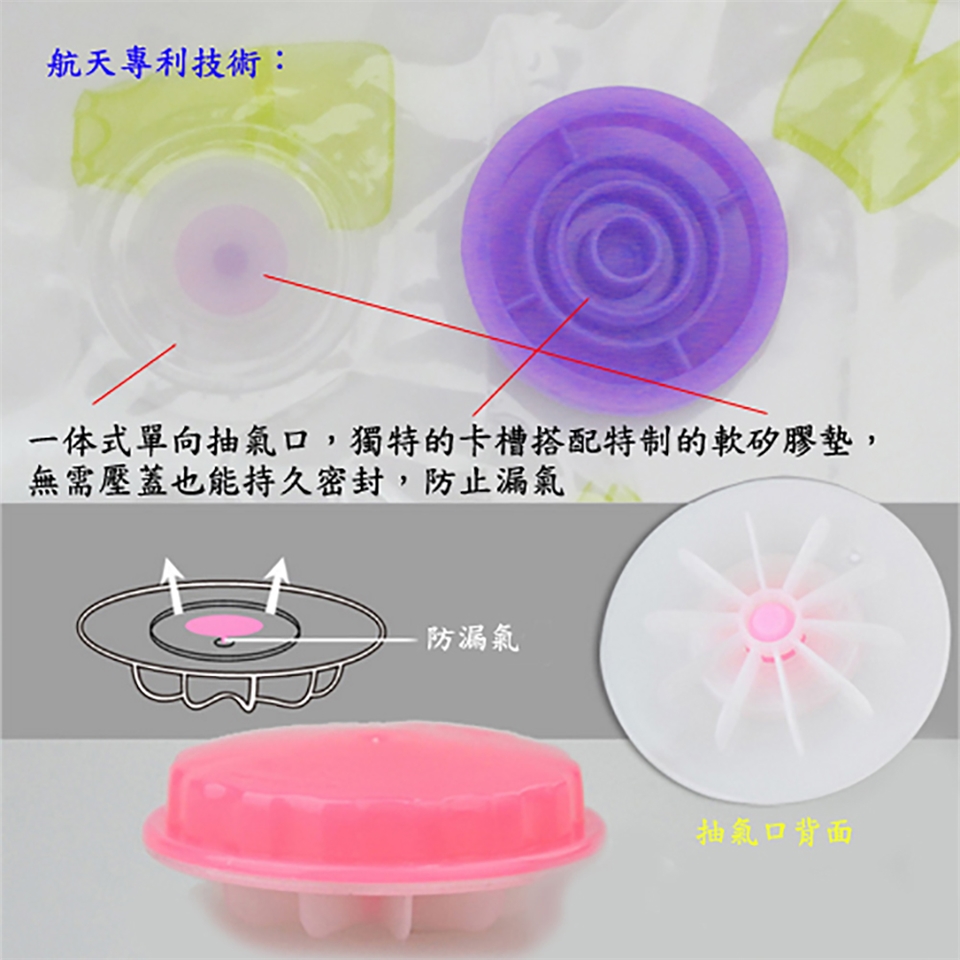 一体式單向抽氣口,獨特的卡槽搭配特制的軟矽膠墊,無需壓蓋也能持久密封,防止漏氣。