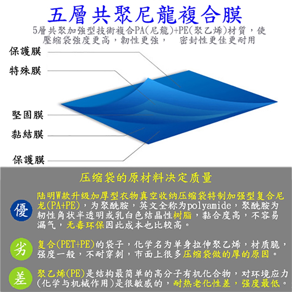 ■採用5層共聚加強型技術複合PA(尼龍)+PE(聚乙烯)材質,使壓縮袋強度更高,韌性更強,