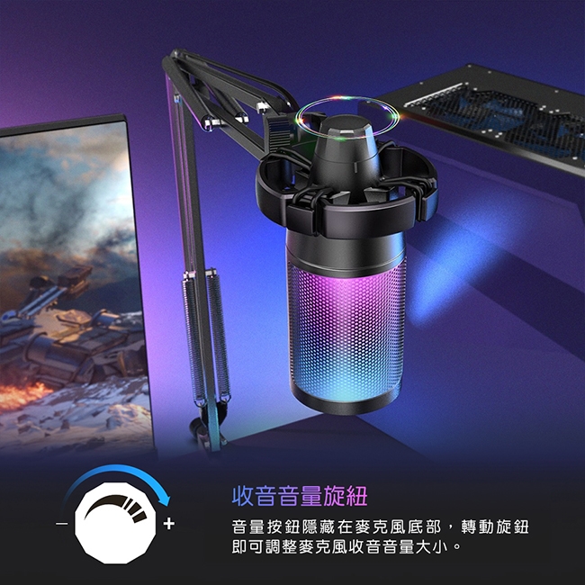 音量按鈕隱藏在麥克風底部,轉動旋鈕即可調整麥克風收音音量大小。