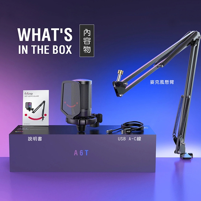 1. 產品內含A6T麥克風*1、防震架*1、防噴罩*1、麥克風懸臂*1、傳輸線*1、說明書*1。