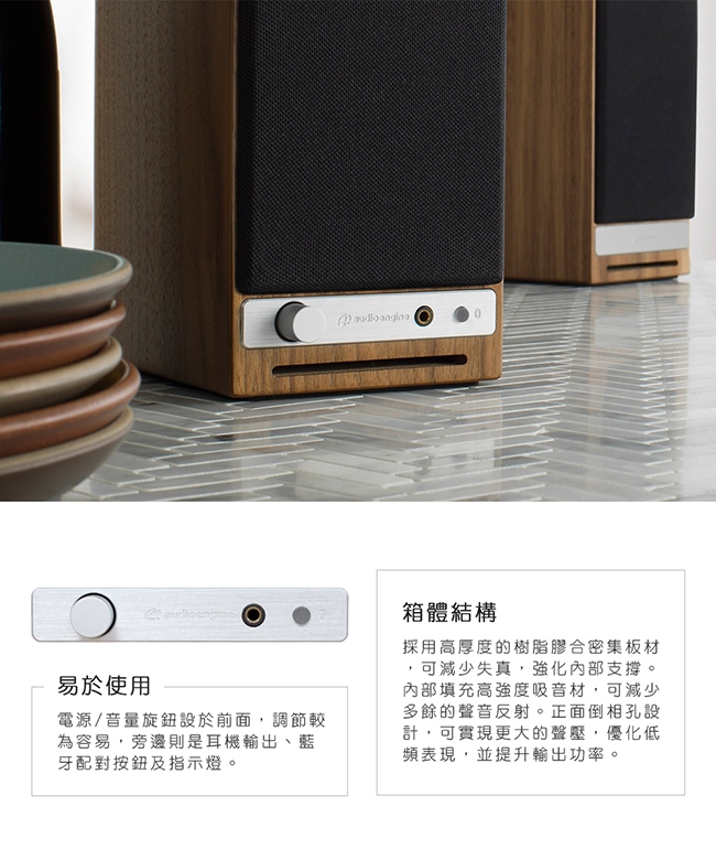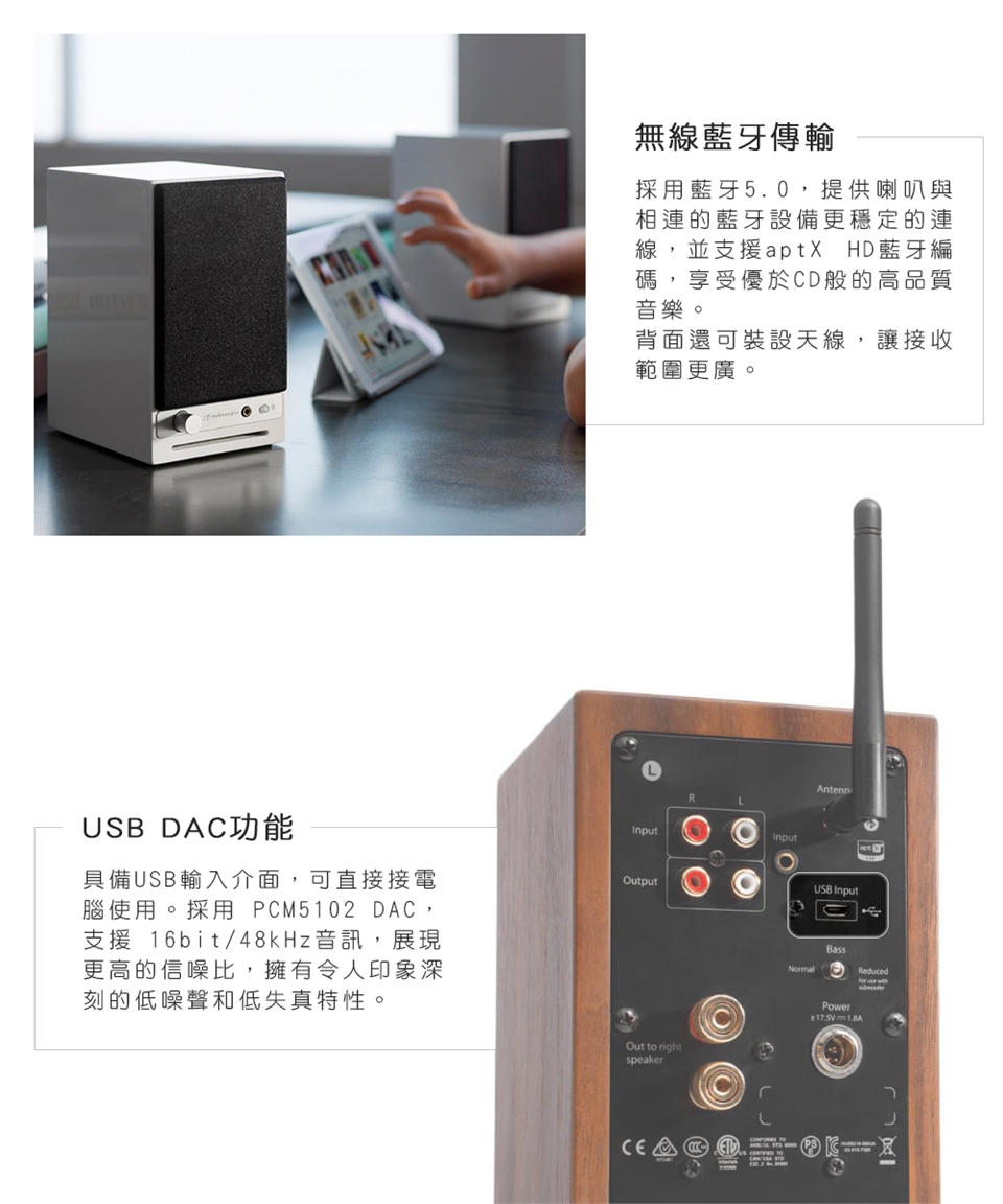 支援3.5mm立體聲、RCA、USB、藍牙等連接方式,無需做按鍵切換,連接即可享受Hi-Fi立體聲。可與多款應用程式、音樂和設備搭配使用。