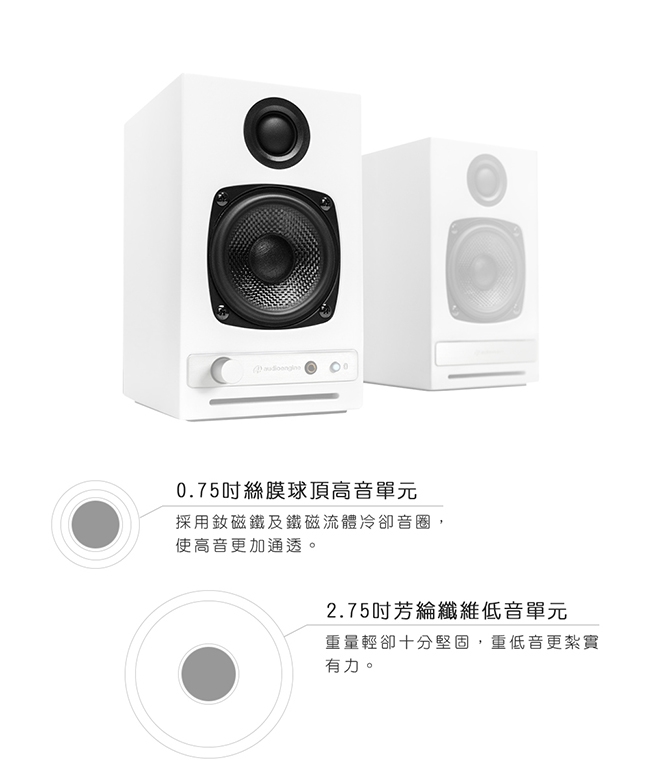 2.75吋芳綸纖維低音單元重量輕卻十分堅固,重低音更紮實有力。