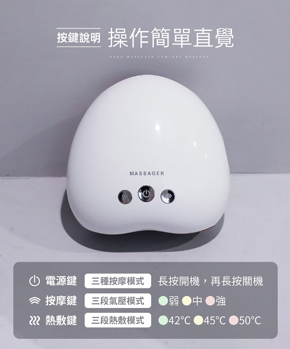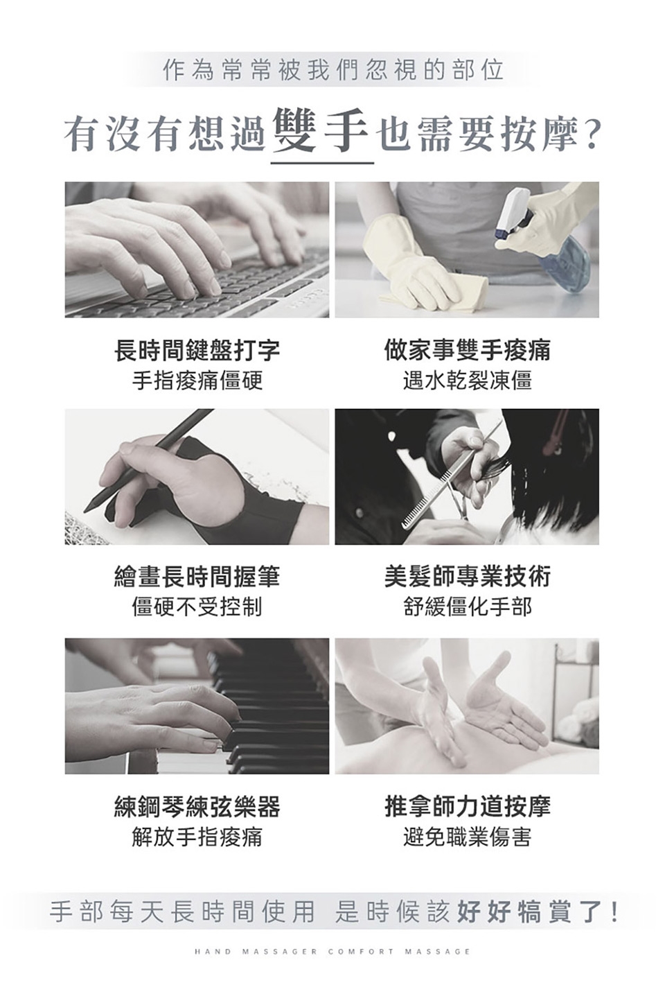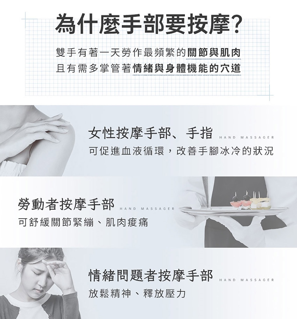※ 進行過手部手術、手部有腫脹炎症、瘀血、嚴重關節炎外傷等手部疾病者;有心、腦肺方面疾病者;骨質疏鬆、軟組織疾病者;有中風疾病;嬰幼兒或孕婦請勿使用。