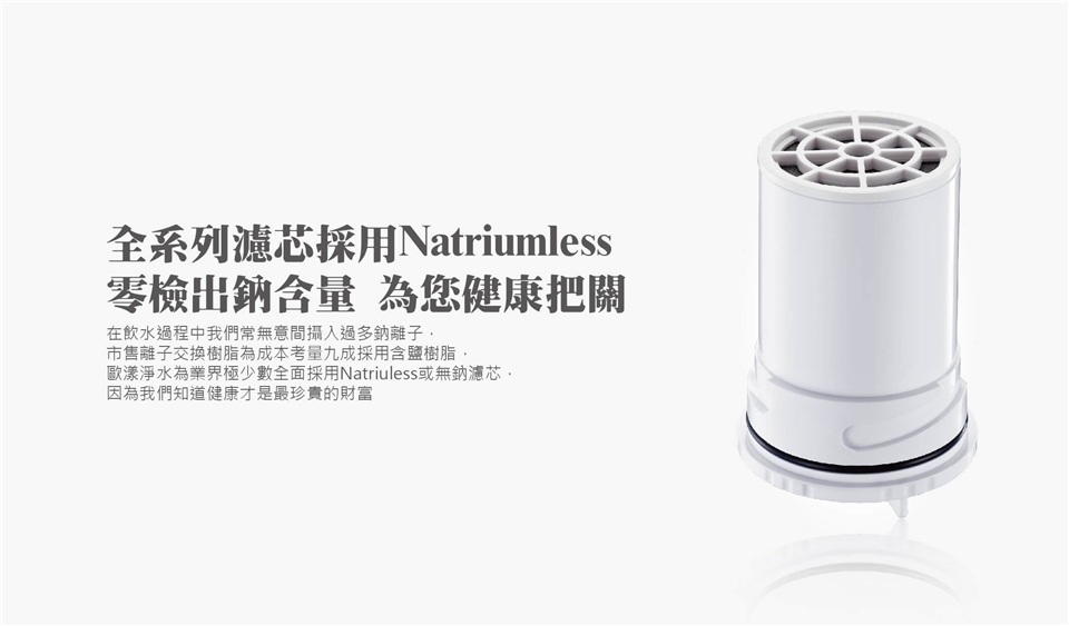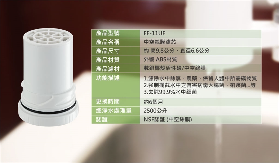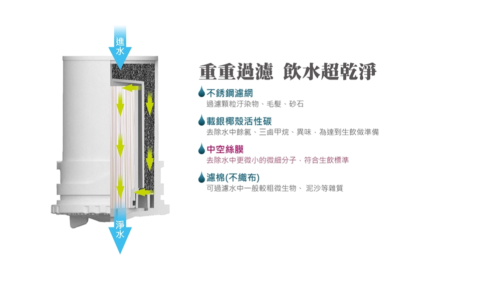 ● NSF認證中空絲膜濾材,孔徑在0.15微米,小於水中細菌,並可保留水中礦物質