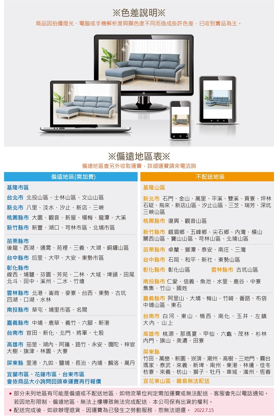 下單前請先丈量電梯或樓梯/家裡門寬/必經路程寬度及高度,確保沙發可上,訂製商品如因個人因素不可退換貨,我司亦不負擔吊車費用,謝謝。