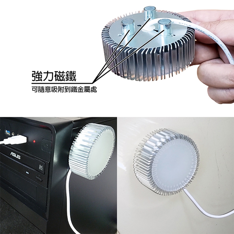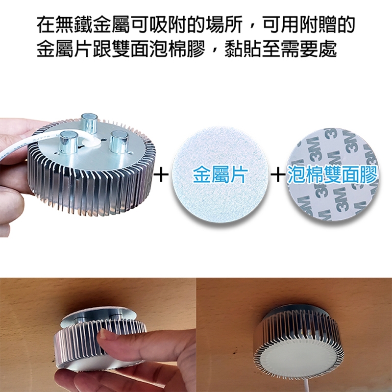 背面有強力磁鐵,方便有效吸附。若在沒鐵的地方貼上有背膠的鐵片,再把LED燈吸至鐵片上可自由運用。
