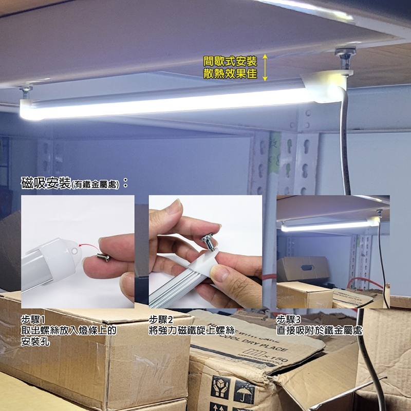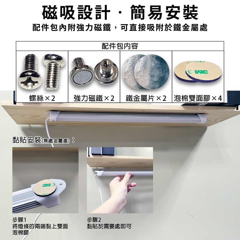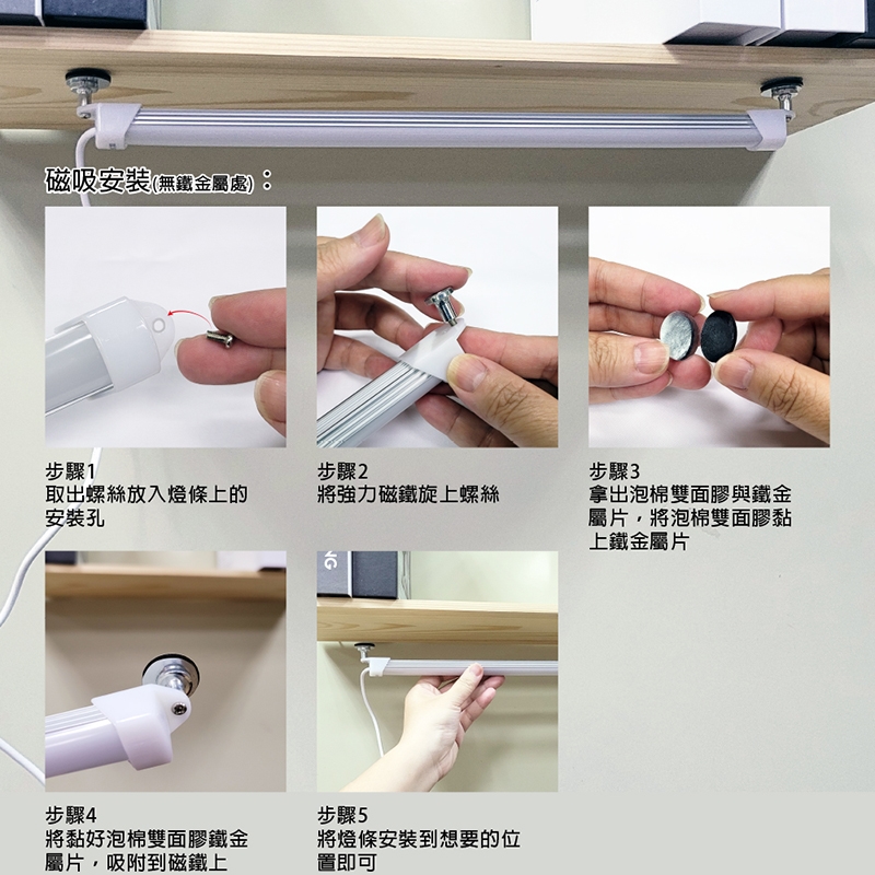 免鑽洞,另附強力磁鐵,可用鏍絲鎖上方便有效吸附。若在沒鐵的地方貼上有背膠的鐵片,再把LED燈吸至鐵片上或者是直接使用雙面強力背膠黏貼,自由運用。