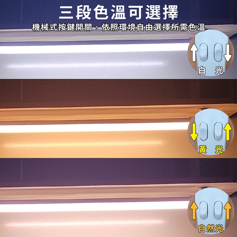 - 調光開關,3種色溫 (白光、自然光、黃光),方便使用。