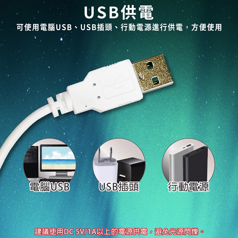 供電方式使用USB接頭,適用於任何5V USB輸出供電電源,如手機充電器、行動電源、電腦USB皆可以供電。