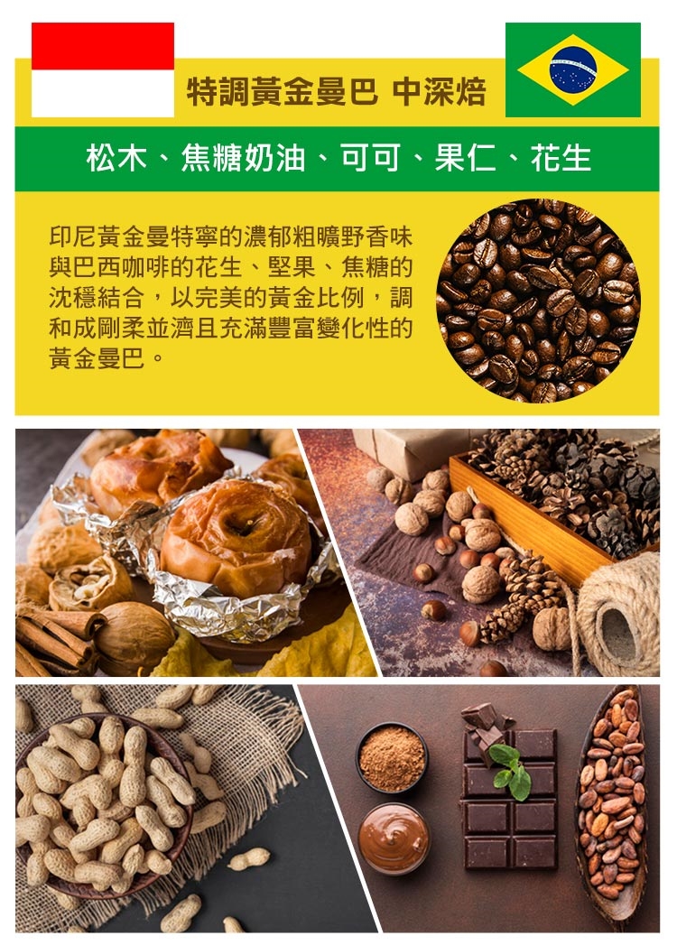 印尼黃金曼特寧的濃郁粗曠野香味與巴西咖啡的花生、堅果、焦糖的沈穩結合,以完美的黃金比例,調和成剛柔並濟且充滿豐富變化性的黃金曼巴。