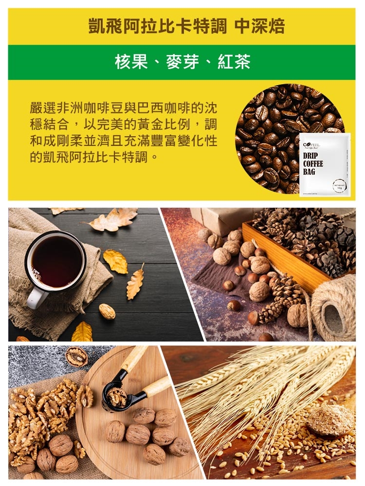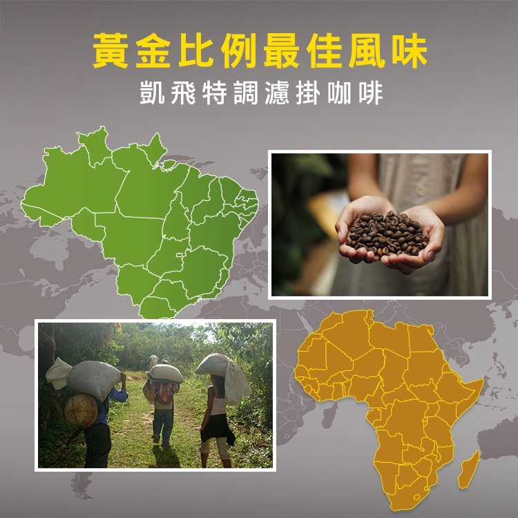 嚴選非洲咖啡豆與巴西咖啡的沈穩結合,以完美的黃金比例,調和成剛柔並濟且充滿豐富變化性的凱飛阿拉比卡特調。