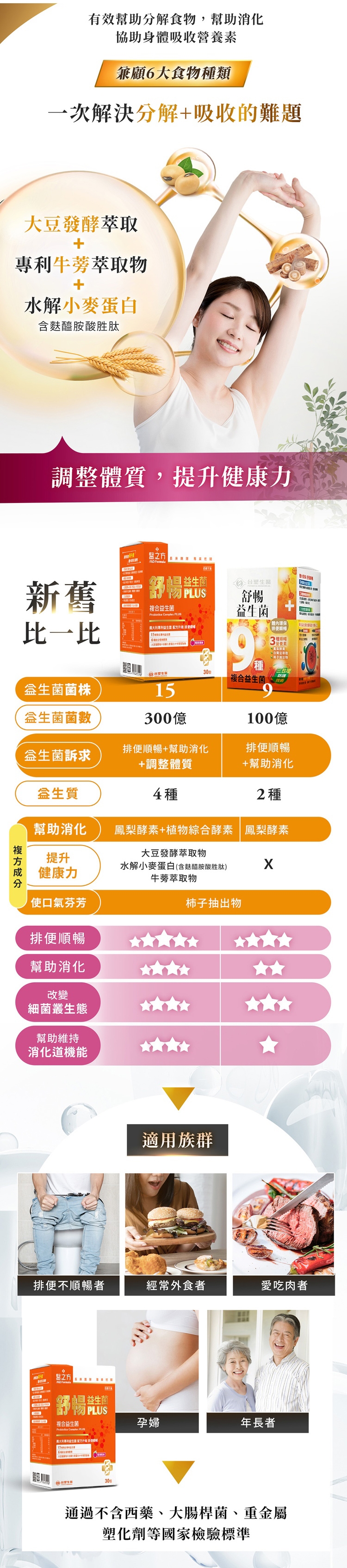 成份: 乳酸菌粉(含乳糖、乳糖醇(甜味劑)、Bifidobacterium bifidum、Bifidobacterium . Lactis BS01、Bifidobacterium breve BR03、Bifidobacterium longum、Lactobacillus reuteri、Lactobacillus paracasei、Lactobacillus plantarum LP01、Lactobacillus rhamnosus、Lactobacillus casei、Lactobacillus salivarius、Lactococcus lactis subsp. lactis、Lactobacillus acidophilus、 Lactobacillus fermentum、Lactobacillus johnsonii、Streptococcus thermophiles)、氧化鎂、D-山梨醇(甜味劑)、黑嘉麗果汁粉[砂糖、麥芽糊精、黑嘉麗濃縮汁、蘋果濃縮汁、檸檬酸、檸檬酸鈉、香料(香料、焦糖色素)、食用紅色六號]、檸檬酸、蘋果濃縮汁、阿拉伯膠、脫脂奶粉、複合寡多糖[菊糖(菊苣纖維)、果寡糖、木寡糖、半乳寡糖]、鳳梨萃取物(含鳳梨酵素)、香料、蔓越莓果汁粉(麥芽糊精、蔓越莓濃縮汁、葡萄汁色素、辛烯基丁二酸鈉澱粉、黑加侖濃縮汁、檸檬酸、蔓越莓香料)、花果抽出物(洛神花、接骨木莓、玫瑰果、檸檬皮、香料、麥芽糊精)、維生素C、中鏈脂肪酸甘油酯粉(中鏈脂肪酸、麥芽糊精、麥芽糖漿、酪蛋白鈉、脂肪酸甘油脂、乳酸硬脂酸鈉、磷酸氫二鉀、多磷酸鈉、維生素E)、大豆發酵萃取物、酵素水解小麥蛋白(含麩醯胺酸胜肽)、甜菜根粉、牛蒡萃取物、植物綜合酵素(麥芽糊精、澱粉分解酵素、蛋白分解酵素、脂肪分解酵素、乳糖分解酵素、纖維分解酵素)、柿子抽出物。