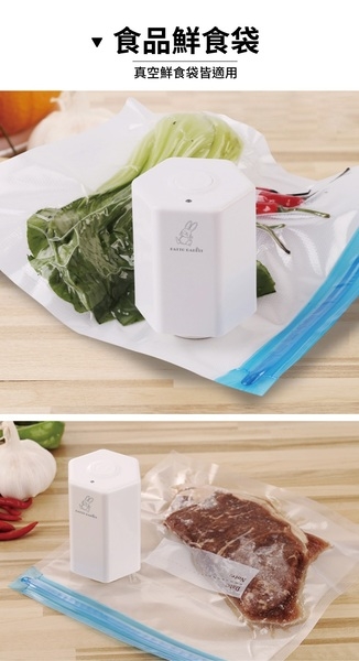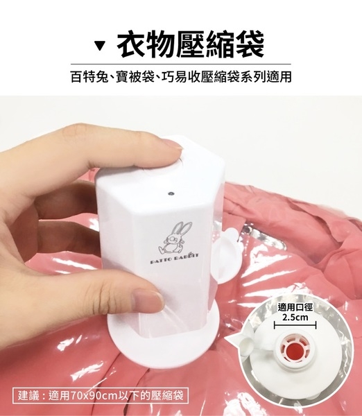 將吸塵器接上袋身上方啣接頭,開啟電源並一邊整理收納袋,使其將袋中空氣吸出,蓋上氣閥蓋即可完成。