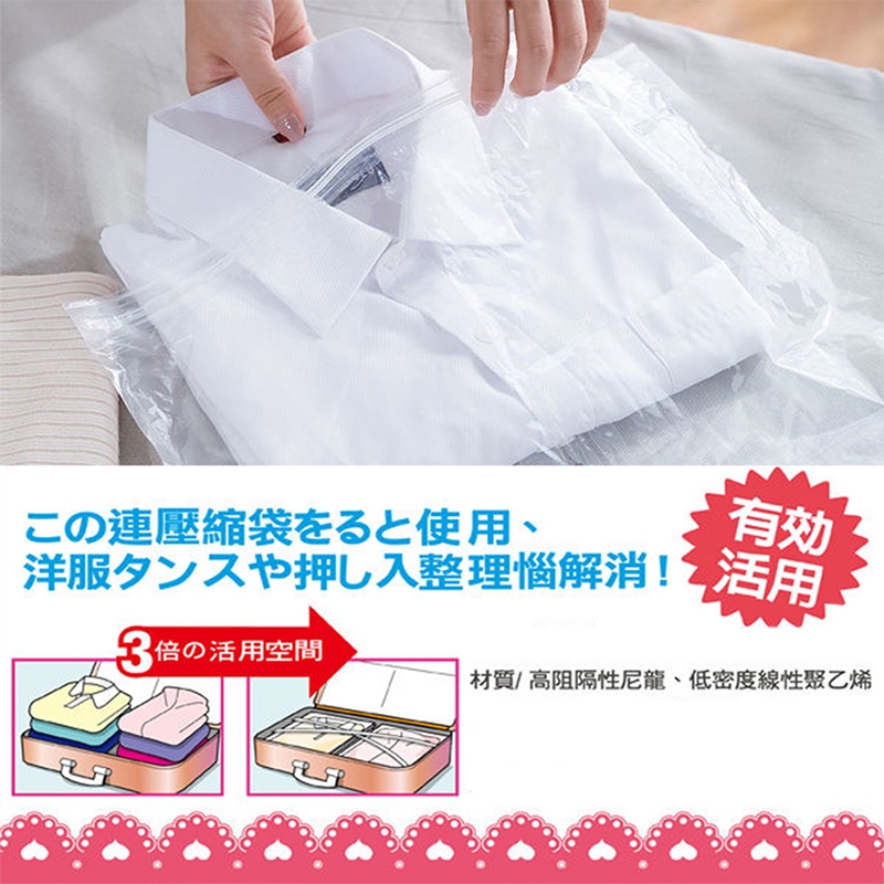 袋內附有一枚專用夾扣工具,當您將衣物平整裝入於壓縮袋內後,利用本工具輕鬆將袋口封緊並將夾扣收好以便下回使用。