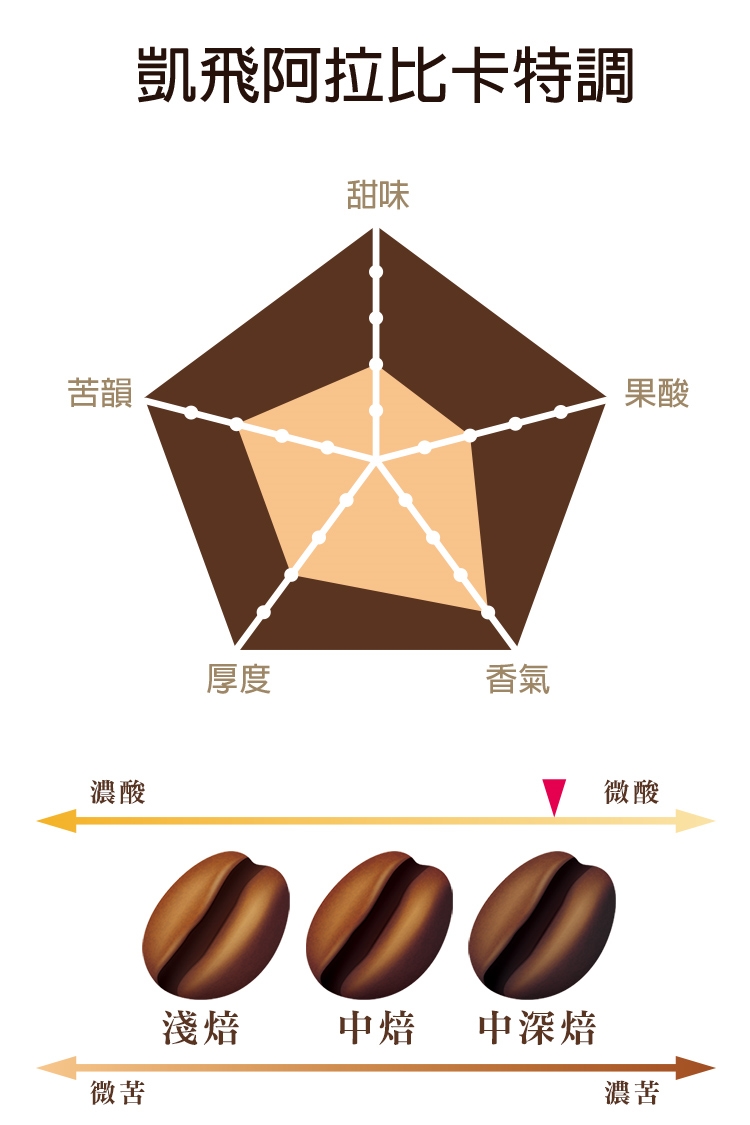 嚴選非洲咖啡豆與巴西咖啡的沈穩結合,以完美的黃金比例,調和成剛柔並濟且充滿豐富變化性的凱飛阿拉比卡特調。
