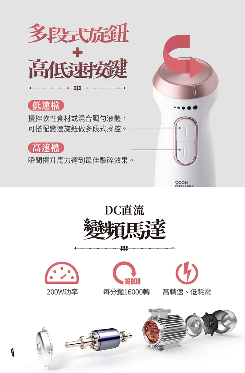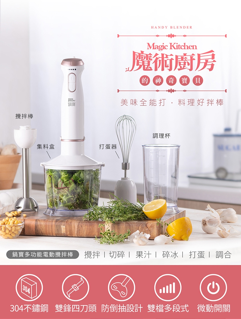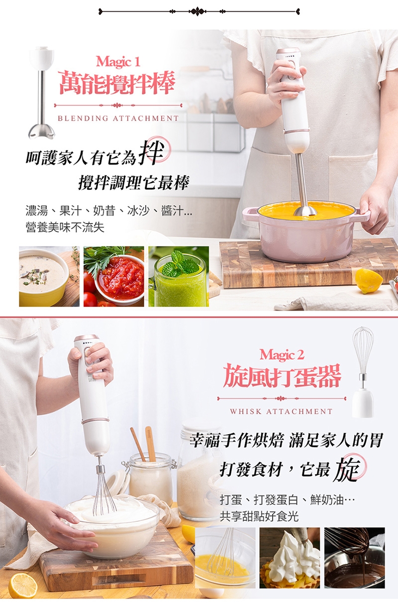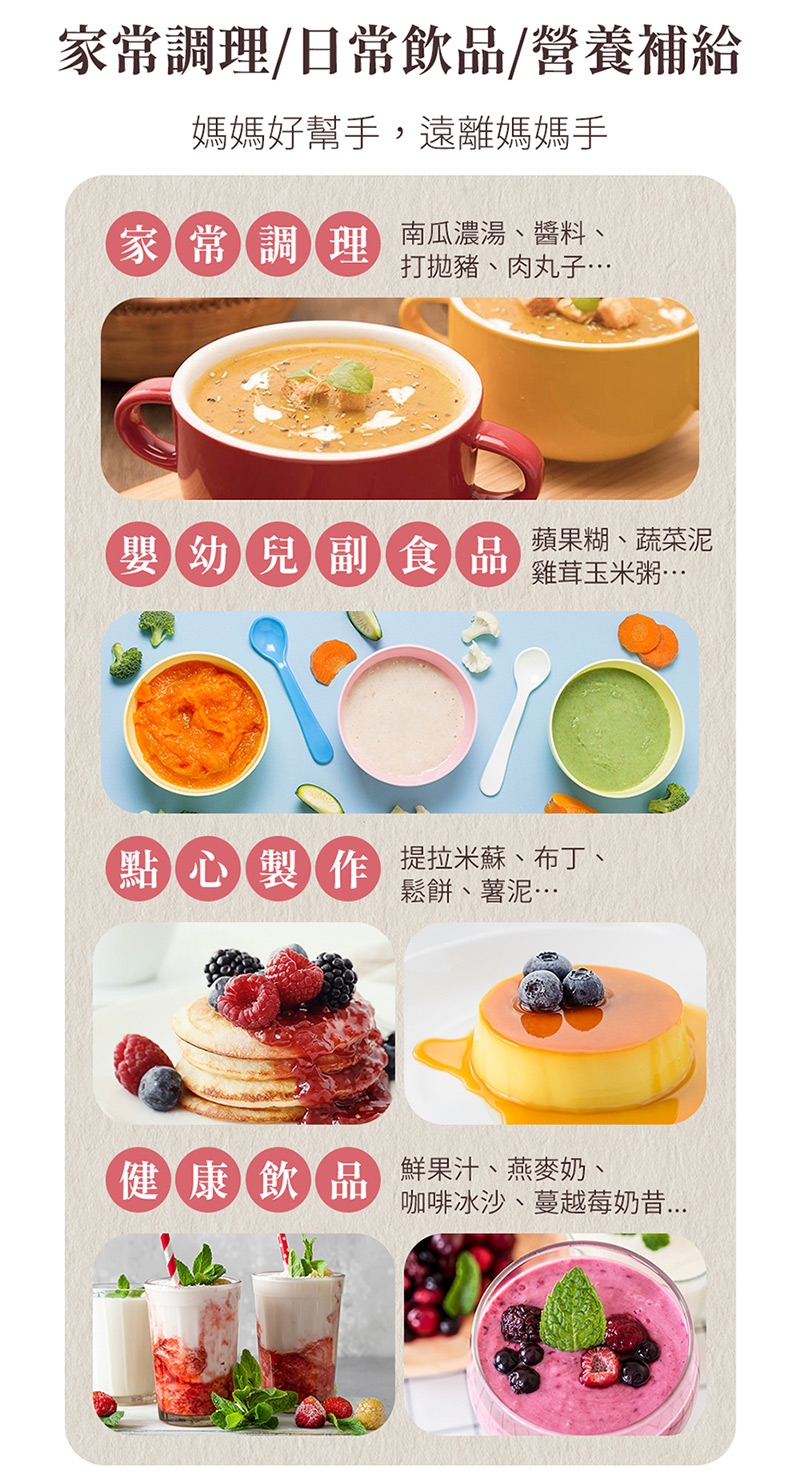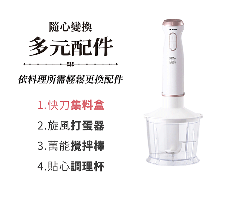 附件:打蛋器x1、打蛋器接頭x1、調理杯x1、集料盒x1、