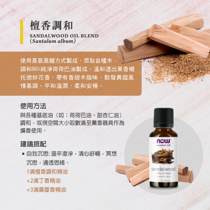調和於各種基底油中(如:荷荷巴油、甜杏仁油)或視空間大小取數滴至薰香器具作為擴香使用。