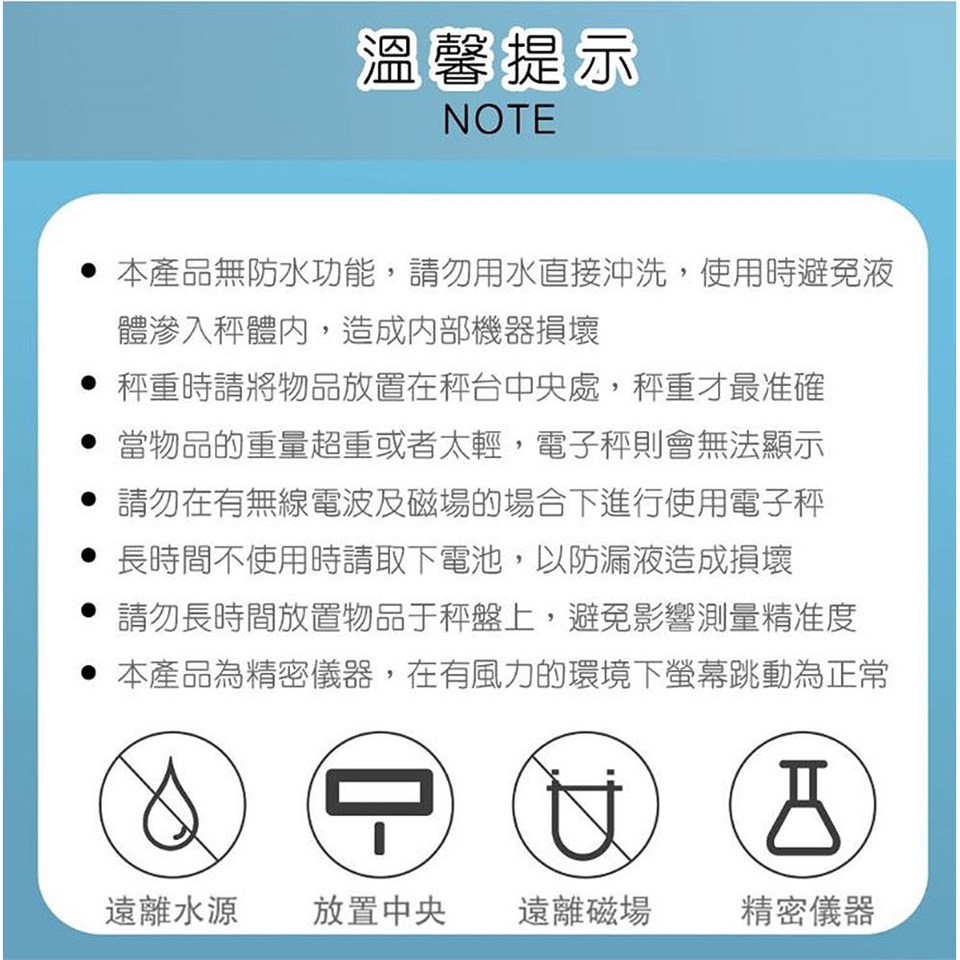 請勿放置超過最大秤重的物品在秤盤上,電子秤會無法顯示。