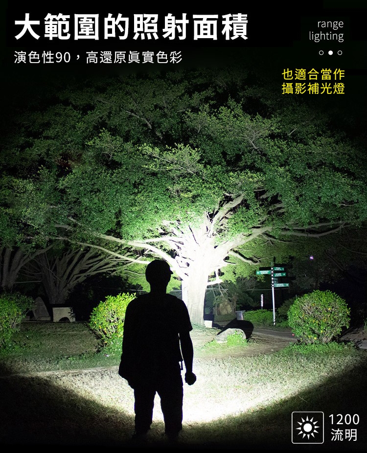 ●強光亮度下最長續航時間約1.5小時(使用2500mAH/18650鋰電池下)。