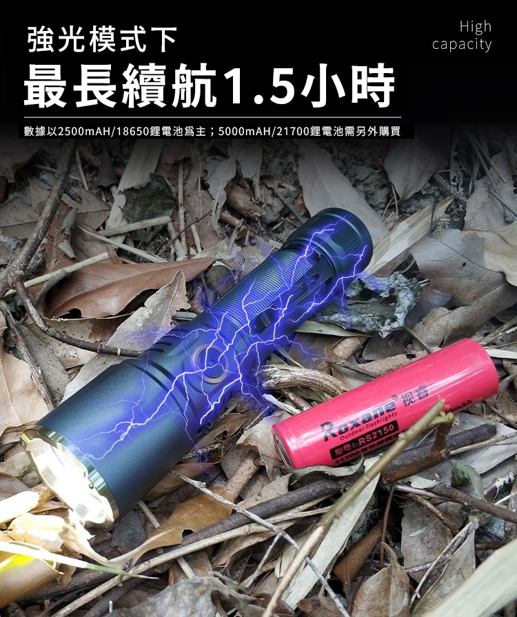 ※另可使用5000mAH/21700鋰電池(需要另外購買), 強光下最長續航時間約3小時。