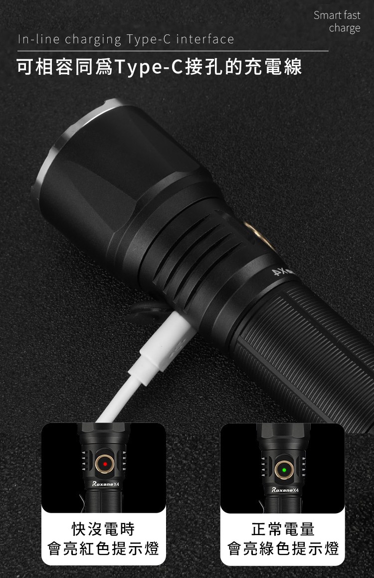 ●【品名】視睿Roxane不頻閃大泛光強光LED變焦手電筒X4組(CRI90高演色/色溫約6500K;Type-C充電;射程412米;亮度1200流明;6段調光;IPX-6防水)適攝影錄影用補光燈.登山露營