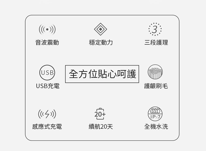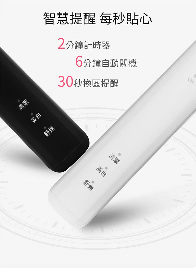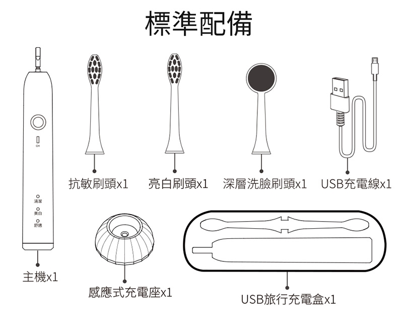 5.產品內容:主機*1/充電座*1/USB旅充盒*1/USB電源線*1/抗敏刷頭*1/亮白刷頭*1/深層洗臉刷頭*1/說明書*1
