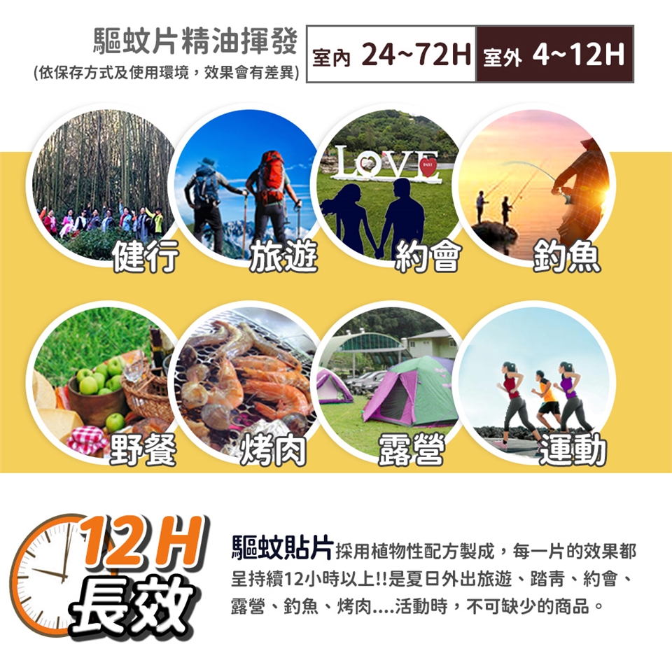 撕開鋁袋外包裝及貼紙背膠,貼於衣服或褲子上,驅蚊貼片精油揮發,室內約24~72小時,戶外約4~12小時。