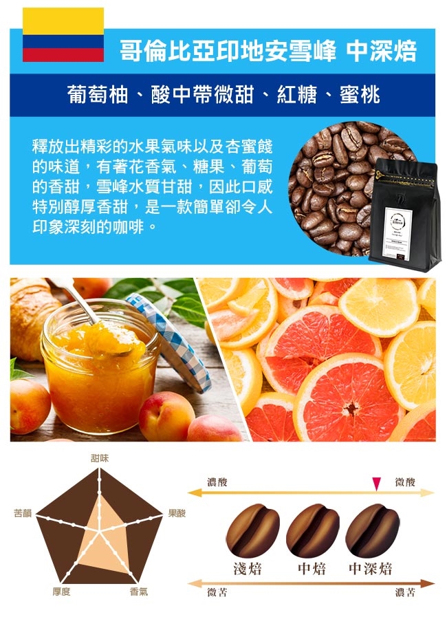 CoFeel 凱飛鮮烘豆哥倫比亞印地安雪峰中深烘焙咖啡豆半磅