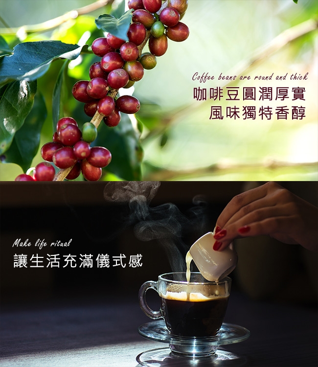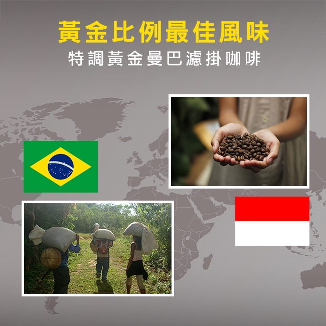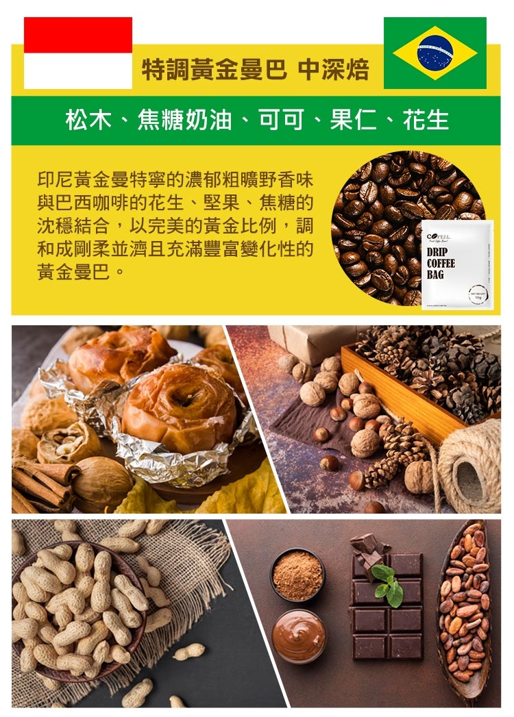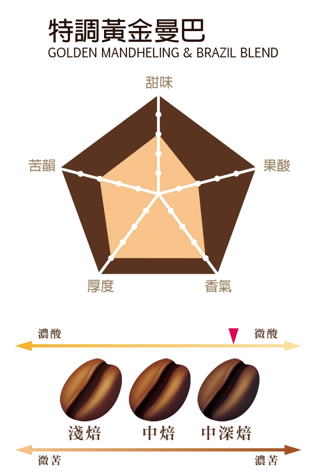 印尼黃金曼特寧的濃郁粗曠野香味與巴西咖啡的花生、堅果、焦糖的沈穩結合,以完美的黃金比例,調和成剛柔並濟且充滿豐富變化性的黃金曼巴。