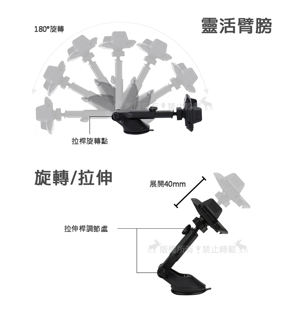 兩段式調節 可達臂長180度調整,手機360度旋轉