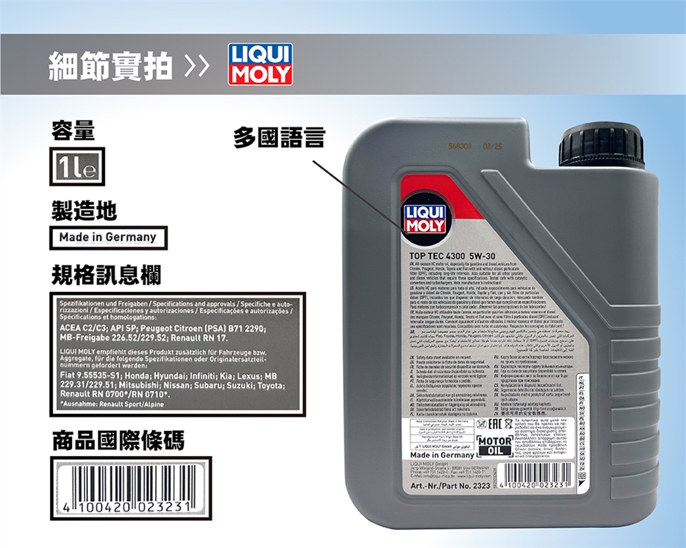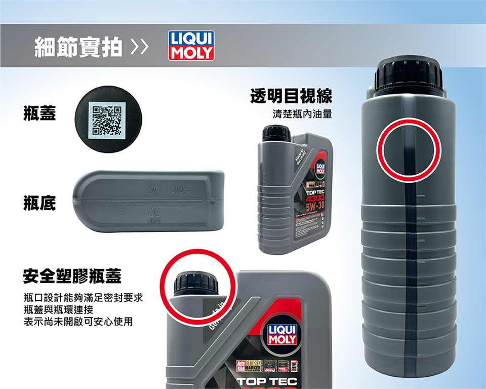 德國製造的 LIQUI MOLY TOP TEC 4300 5W-30 是一款全合成低灰分機油,專為搭載柴油微粒濾清器(DPF)及三元觸媒(TWC)的汽柴油引擎設計,兼顧高效保護與節能環保,滿足多數歐日系車廠潤滑規範,並適用於長效保養里程。