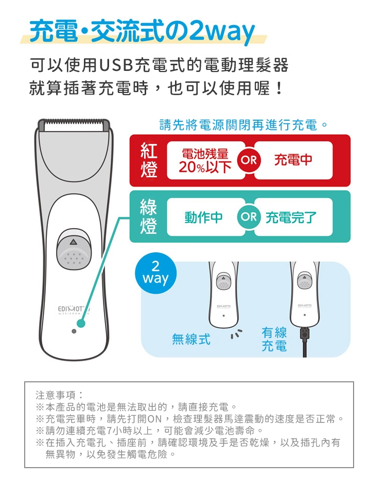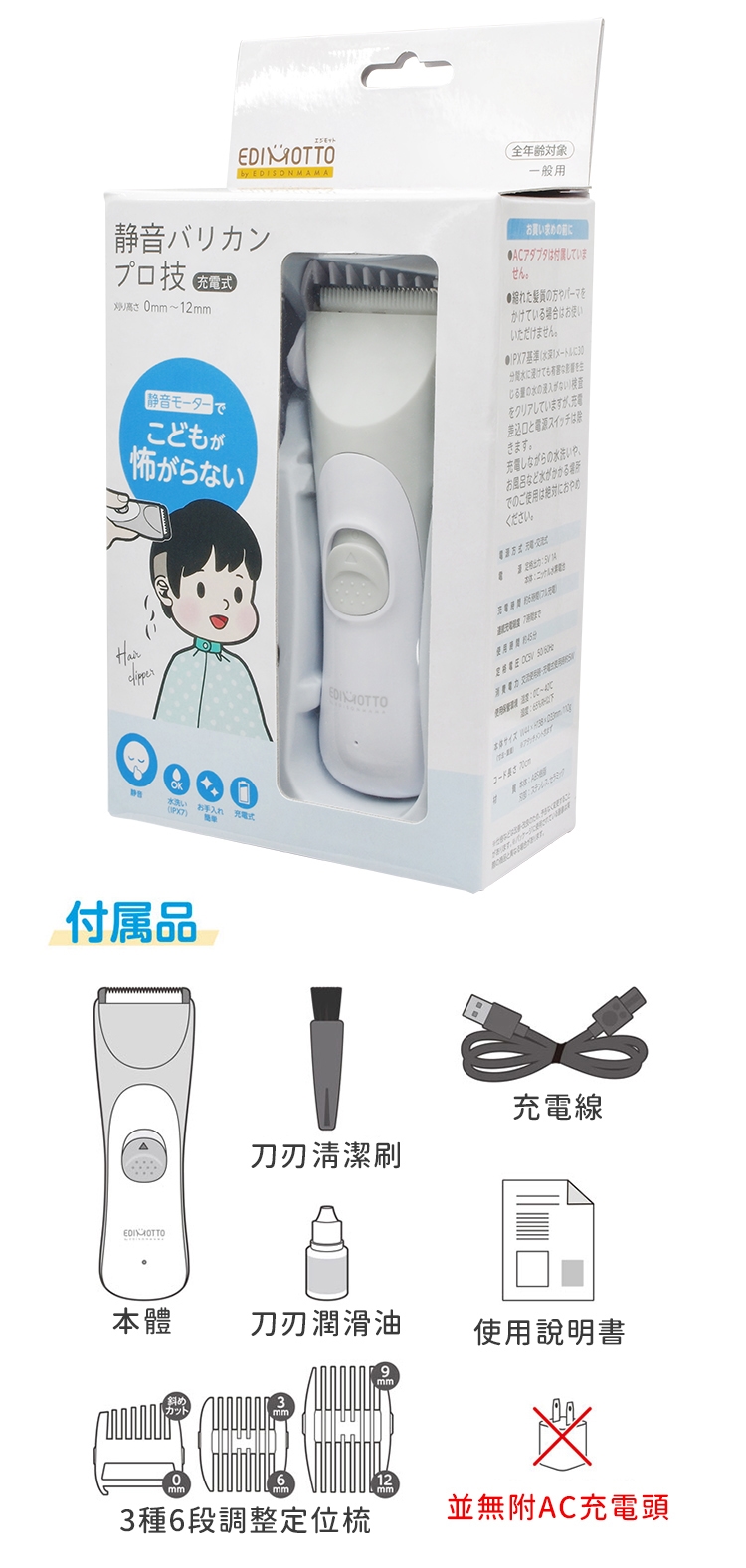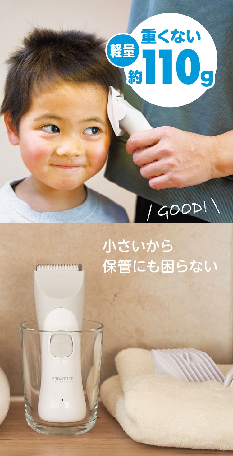 ●【品名】日本EDIMOTTO家用輕巧型電動理髮剪髮器KJH1123剃髮剪(靜音;USB充電;附3種定位梳/潤滑油/清潔刷;不鏽鋼x陶瓷刀刃安全設計)適小朋友小孩幼童