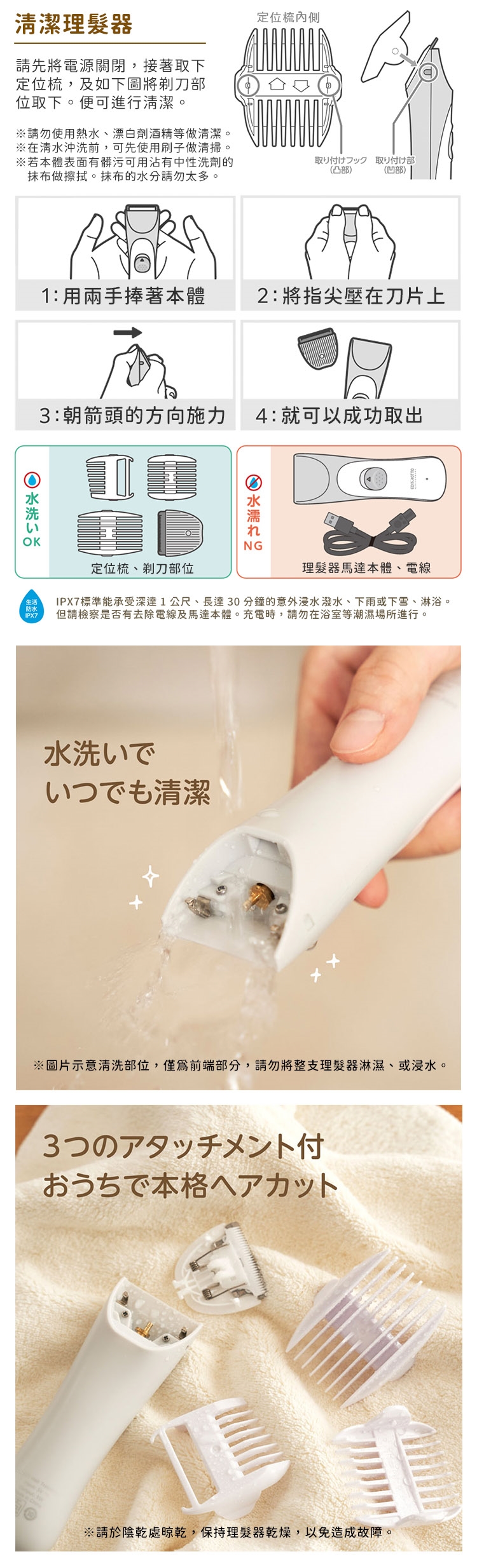 ●髮梳部分、剃刀頭部可水洗(IPx7等級)